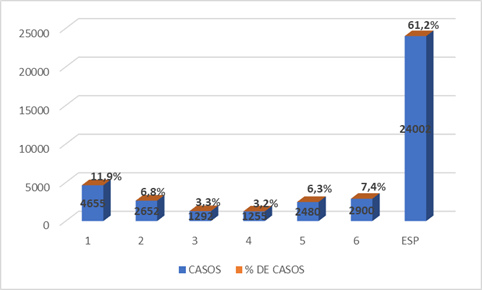 En el siguiente gráfico (1) actualizamos el número de casos por municipio según su categoría que está definida de acuerdo a la población, de 1 a 5 y municipios de categoría especial. El 61,2% de los casos hasta la fecha se registra en los municipios de categoría especial como Medellín, Bogotá, Cali, Barranquilla y Cartagena; el 11,9% de los casos se encuentra en los municipios en categoría 1, cuya población está entre 100.001 y 500.000 habitantes, seguidamente el 6,3% de los casos positivos del virus están en los municipios en categoría 5 con población entre 10.001 y 20.000 habitantes, y el 7,4 % de los casos se registran en los municipios de categoría 6 con población inferior a 10.000 habitantes. Respecto al Boletín 031 se observa un ligero incremento en los municipios de categoría 2 principalmente, y los municipios de categoría 3 y 6.