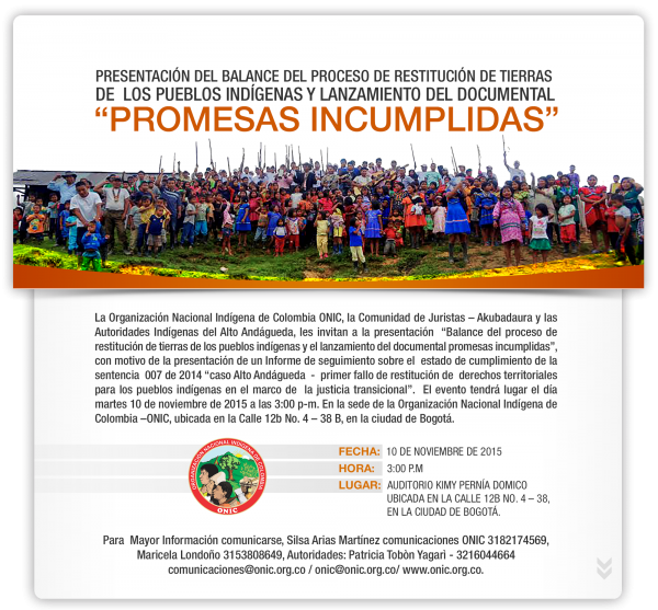 La Organización Nacional Indígena de Colombia – ONIC, la Comunidad de Juristas – Akubadaura y las Autoridades Indígenas del Alto Andágueda, les invitan a la presentación “Balance del proceso de Restitución de Tierras de los Pueblos Indígenas y el lanzamiento del documental Promesas Incumplidas”, con motivo de la presentación de un informe de seguimiento sobre el estado de cumplimiento de la Sentencia 007 de 2014 “Caso Alto Andágueda – primer fallo de restitución de derechos territoriales para los pueblos indígenas en el marco de la Justicia Transicional”.